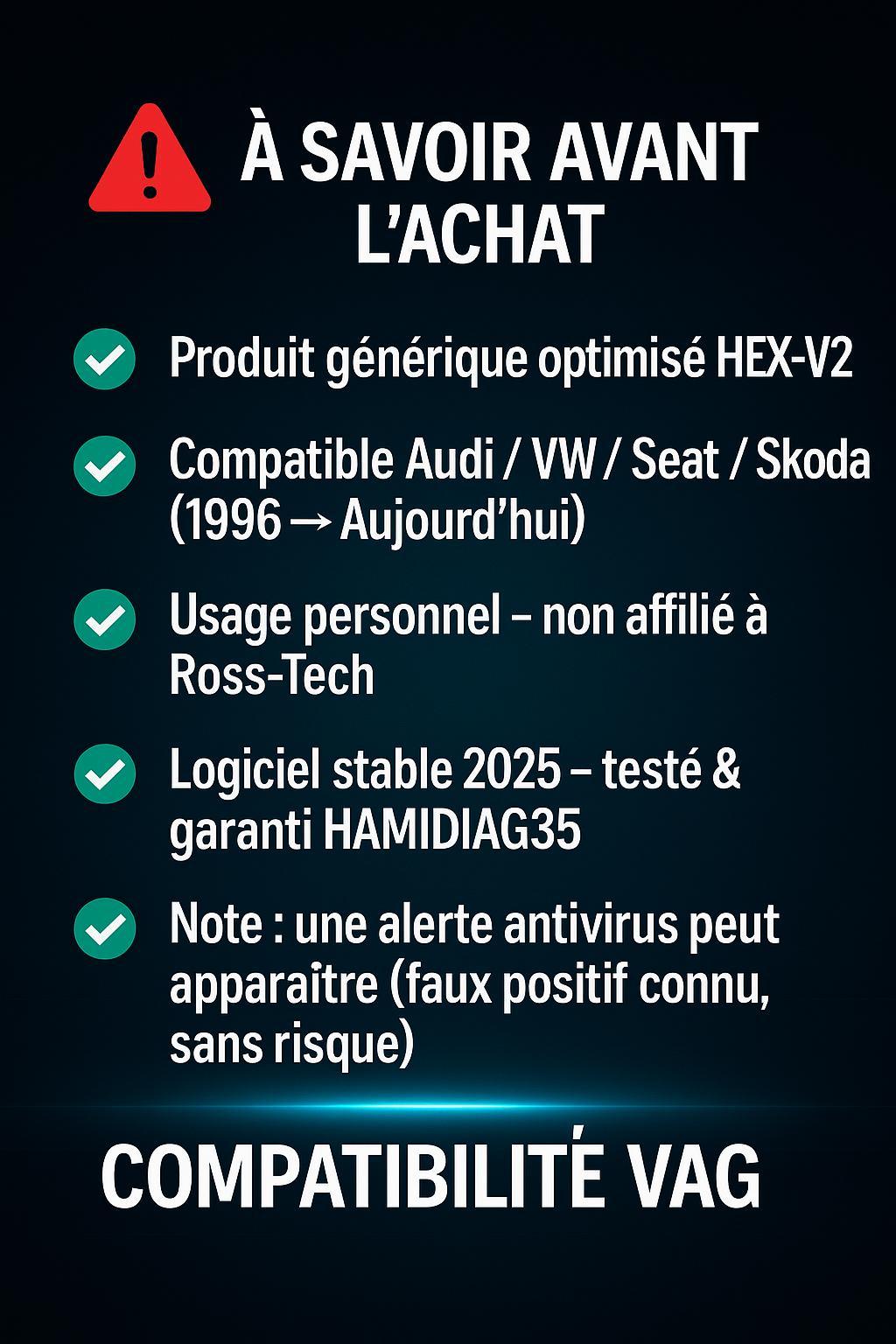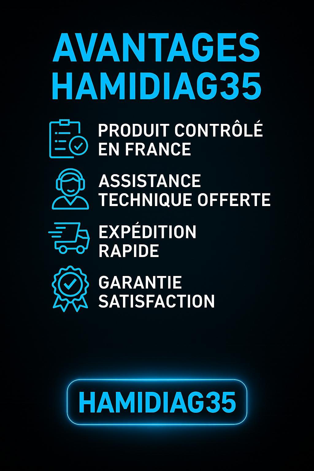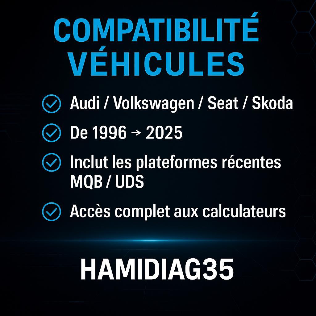 L’interface de diagnostic HAMIDIAG35 pour le groupe VAG est compatible avec tous les véhicules Volkswagen, Audi, Seat et Skoda jusqu’à 2025. Elle permet la lecture des défauts, l’effacement des codes, l’activation de fonctions cachées, le test des injecteurs et bien plus encore.